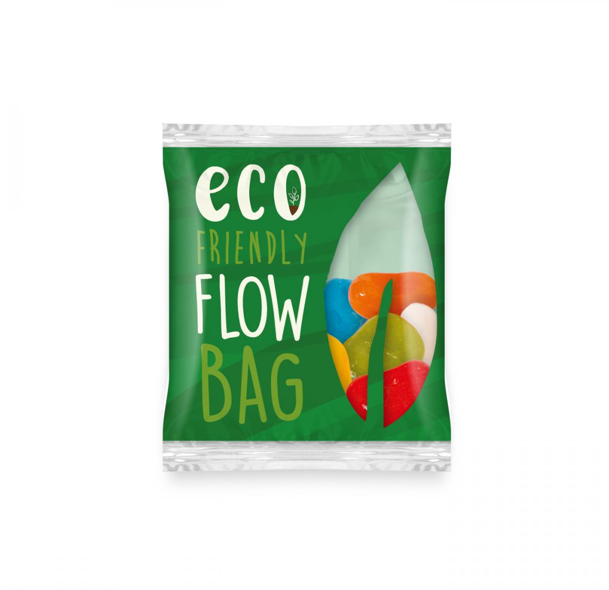 Our Eco Flow Bags a made from plants rather than plastic. With a non-gloss full colour digital print to the bag, allowing for a large branding area. Filled with Jolly Beans.Any flow bag orders from 2000 units above automatically changes to our new eco film. This is to reduce our plastic film manufacturing.