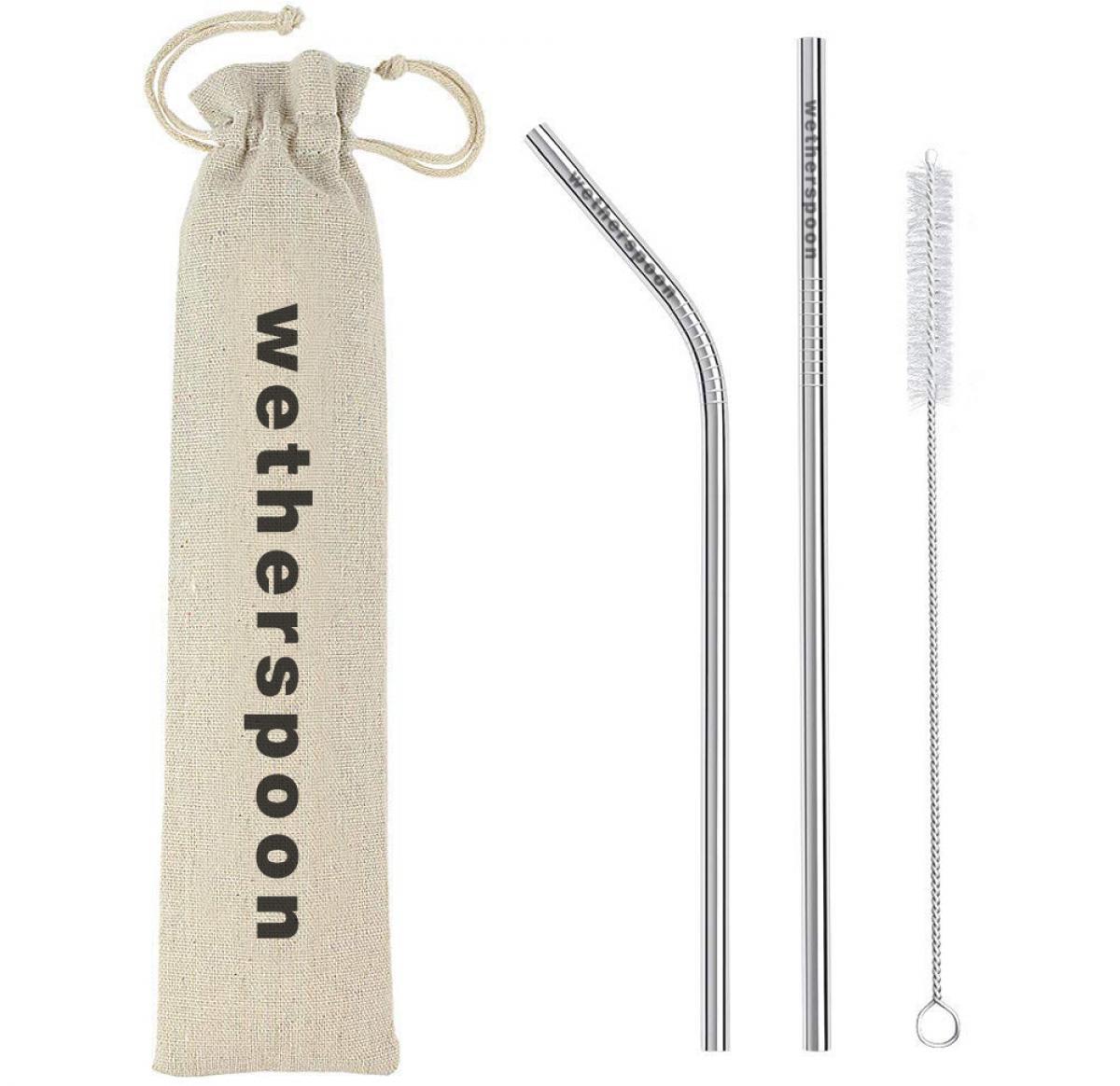 Laser engraved reusable metal drinking straw set, comprises of bag, one bent straw, one straight straw and a cleaning brush. Straws can be laser engraved and the bag can be printed with your logo.