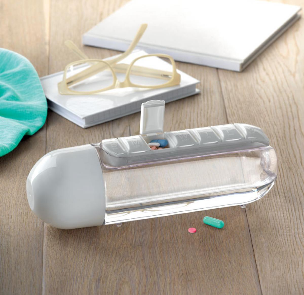 A fantastci new promotional product, a 600m tritan water bottle with a detachable 7 day pill dispenser, perfect for care and nursing homes.