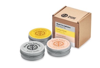 Unisex Travel gift set by Branded by Earth. Includes 50g body wash, shampoo and face scrub. Presented in recycled box. Made from natural ad organic materials, making it a sustainable option with little impact on the environment,