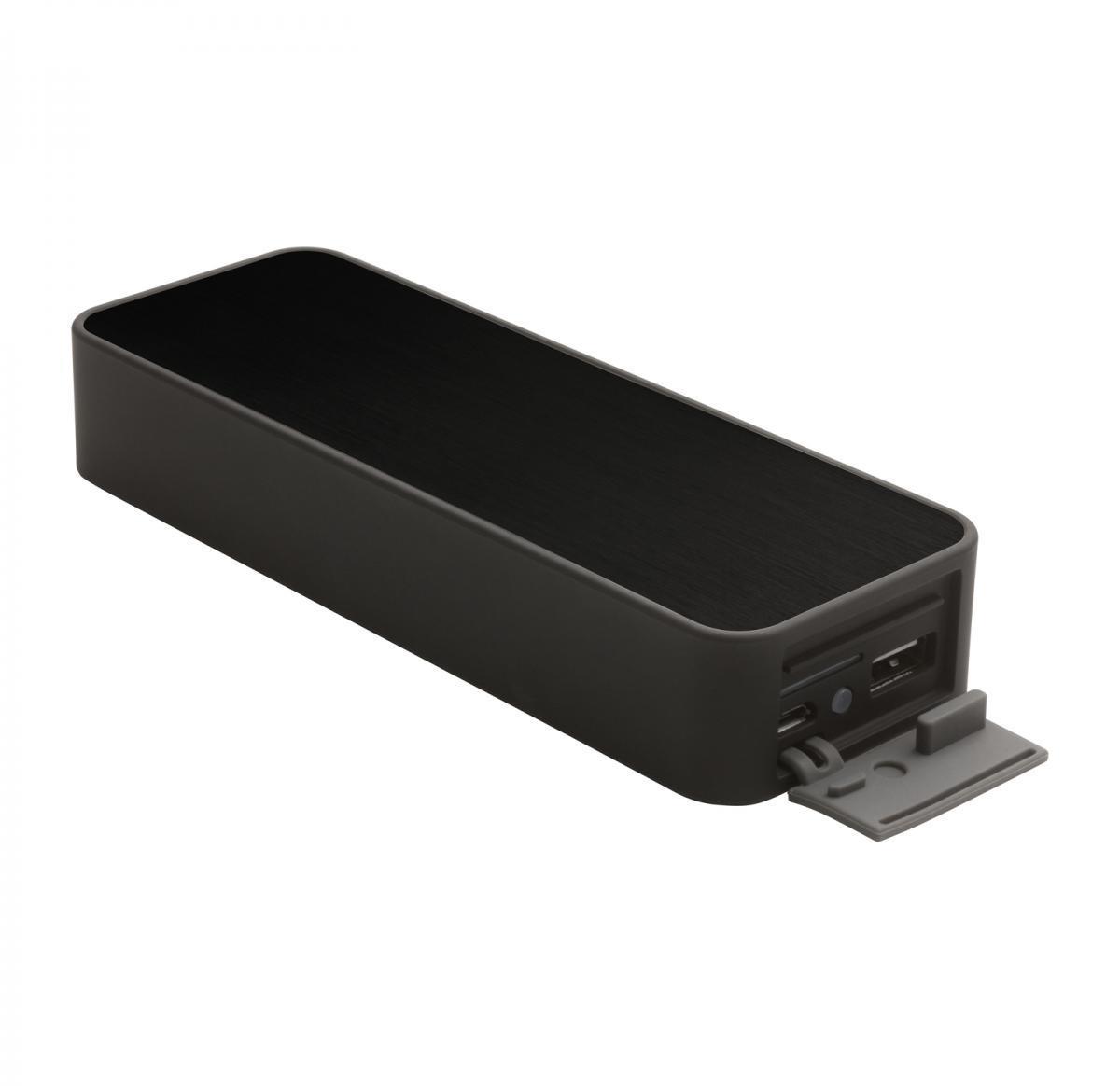 * Speaker with integrated charger and handsfree unit in matt black rubber look with noble brushed metal lid