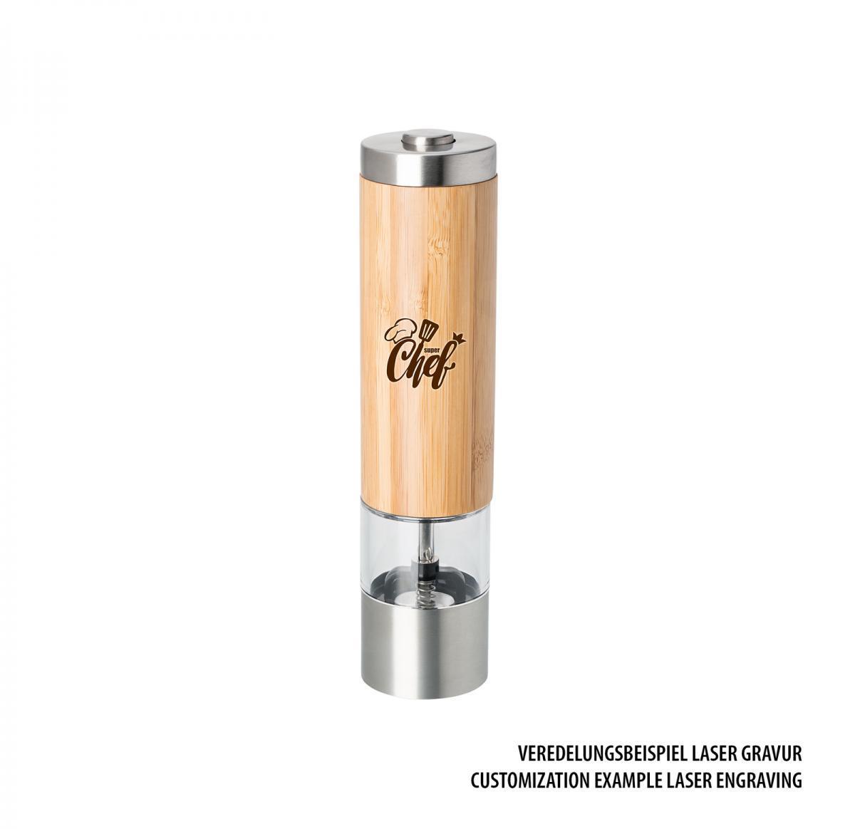 This electronic spice mill is made of several high-valued materials. Its body is made of sustainable bamboo, high-graded stainless steel and with a grinder that is adjustable, made of ceramics. So it is up to you to decide how fine or coarse the mill shall grind. A built-in LED helps you to dose the spices on the food.