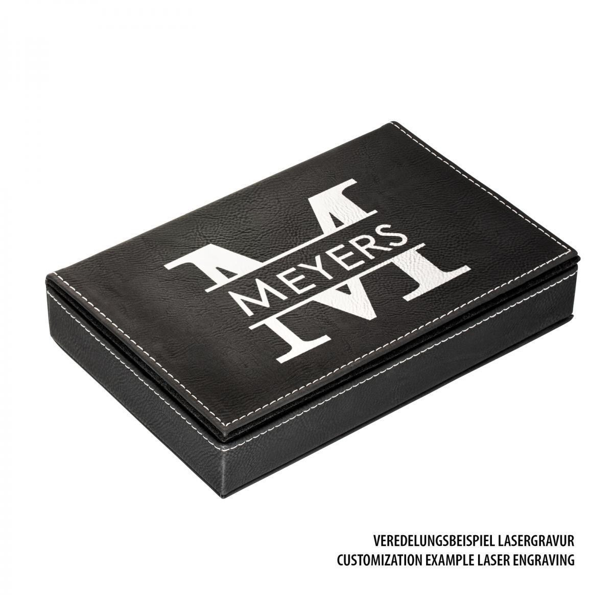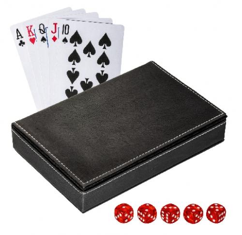 Hold all the trump cards in your hand and use this classic playing card set in a beautiful box with a large finishing area for your advertising. 110 cards with six jokers (French leaf) and a set of dice are included.