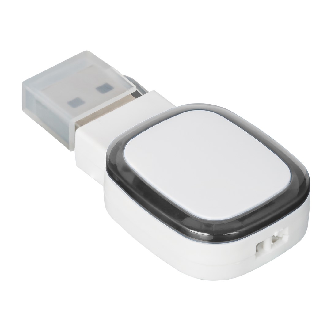 This unique USB flash drive with USB 2.0 is available from stock with either 4 or 8 GB capacity. Higher capacities are available on request. The colour ring around the logo plate is illuminated by LED backlight.