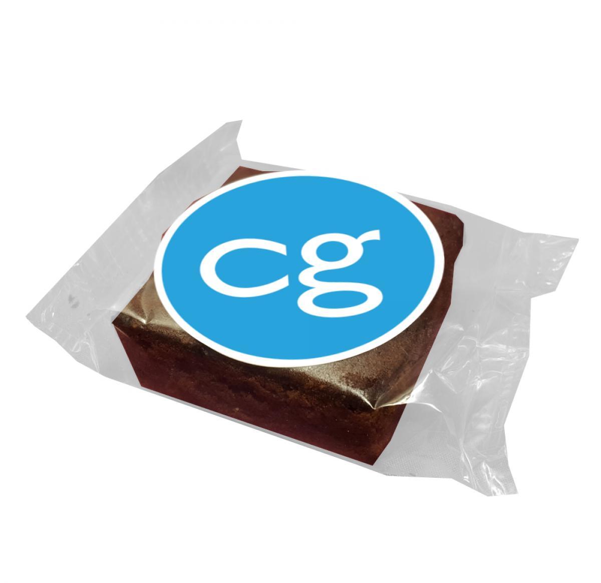 5cm Brownie with a full colour logo sticker, individually wrapped in clear Natureflex compostable film. Vegan option available.