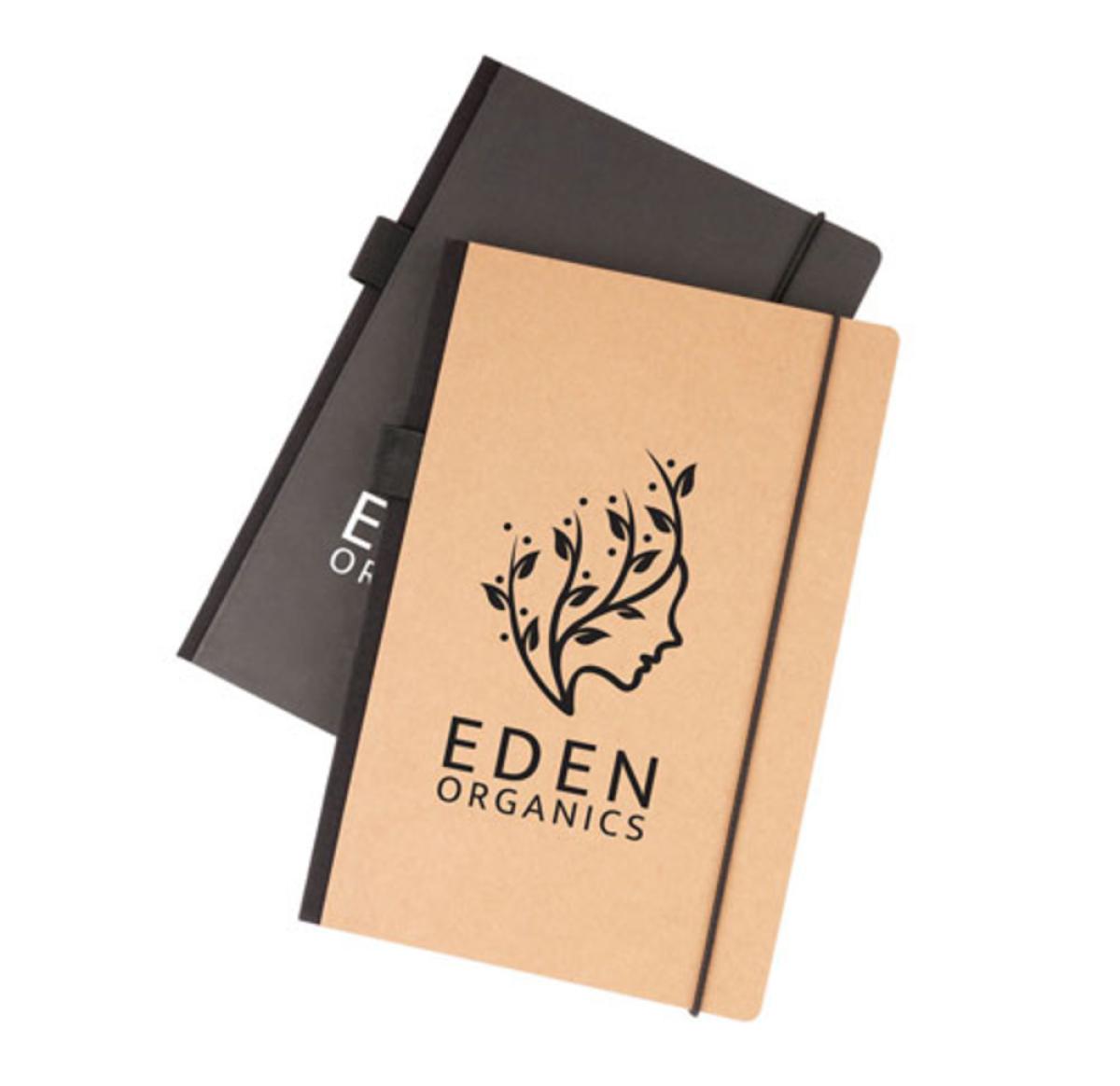 Card cover notebook with RPET polyester spine with 80 pages of lined paper, elastic closure and pen loop. An ideal eco-friendly option for promoting your brand.