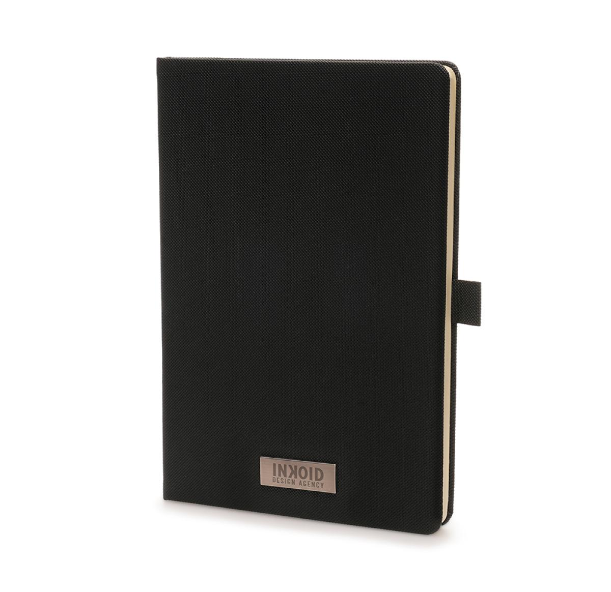 RPET wrapped notebook with PU cover made from recycled polyester and metal plate for engraving. Featuring 80 lined sheets of recycled cream paper, ribbon bookmark and pen loop perfect for a sleek professional look.