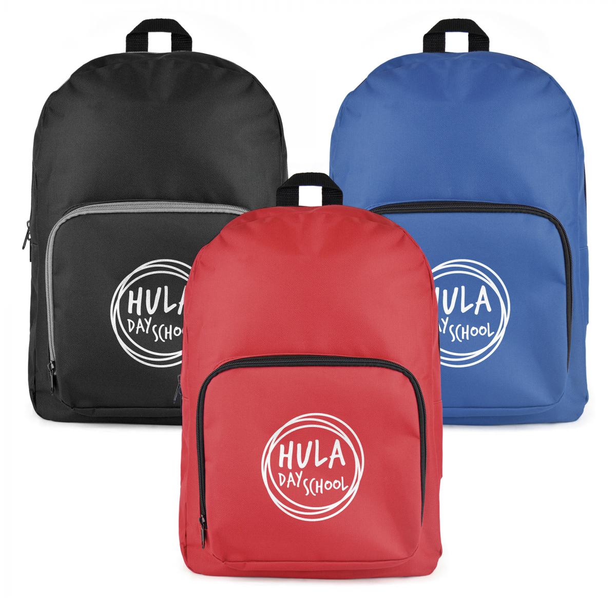 600D polyester coloured backpack with black trim, zip and carry loop. Features include adjustanble padded shoulder straps, large front pocket and zip closure.