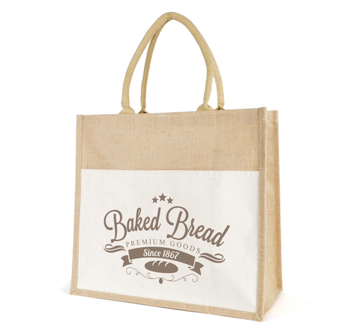 Large laminated natural jute shopper with short cotton rope handles. 10oz cotton canvas front pocket and strong gusset. Jute is eco-friendly and naturally very strong, making it great for carrying those heavier loads.