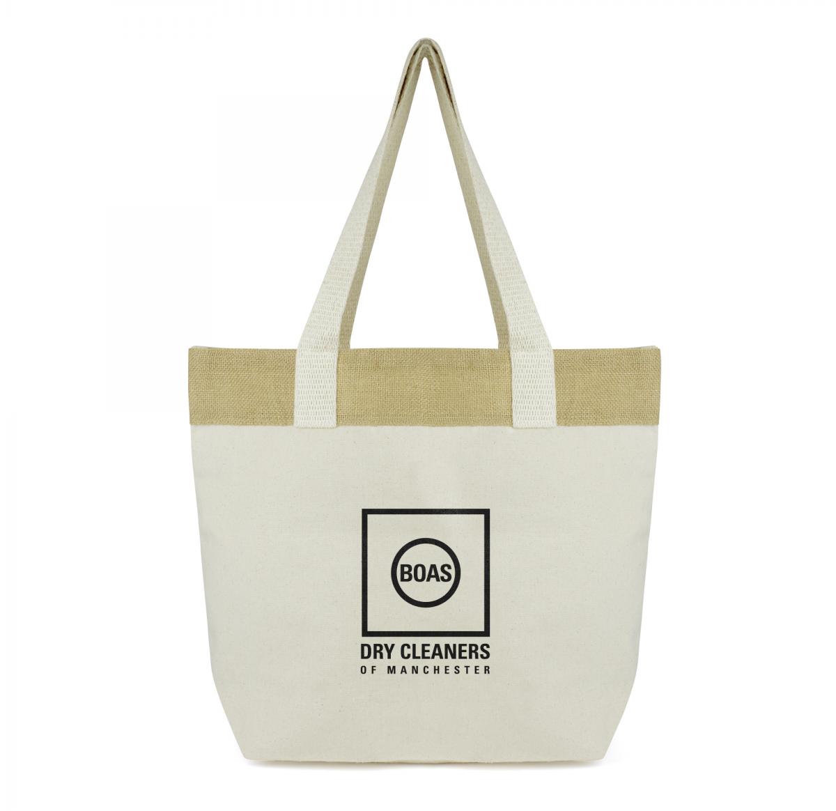 Large 10oz cotton eco-friendly shopper with natural jute stripe and long handles. This biodegradable and recyclable bag is a great eco-minded giveaway for any event.