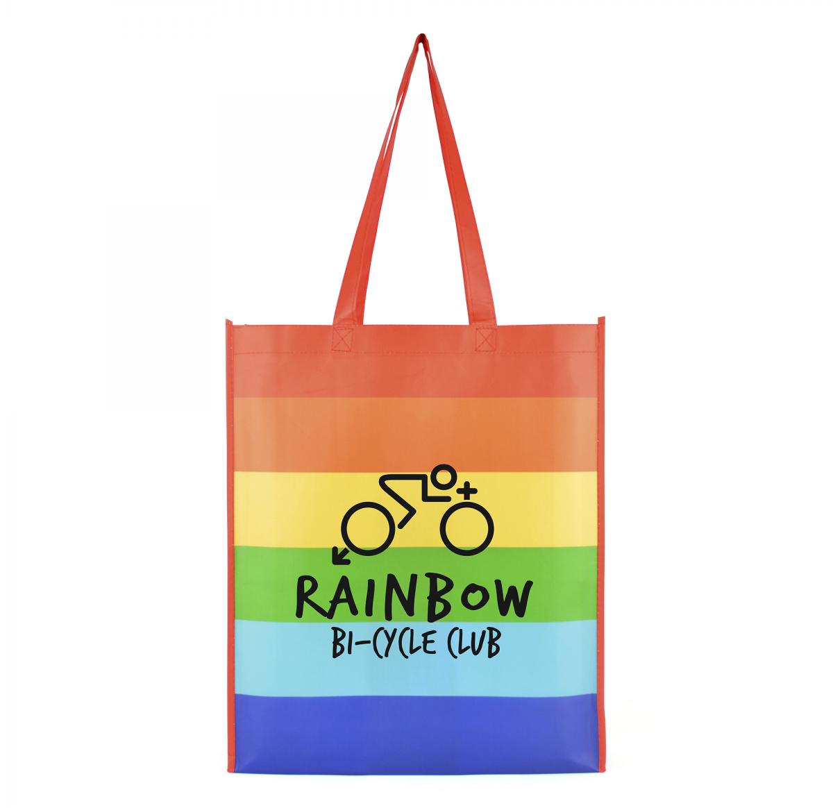 Eco-friendly 80gsm non woven PP shopper with horizontal rainbow print, gusset and long handles. A bright and attractive low cost giveaway perfect for schools or charities.
