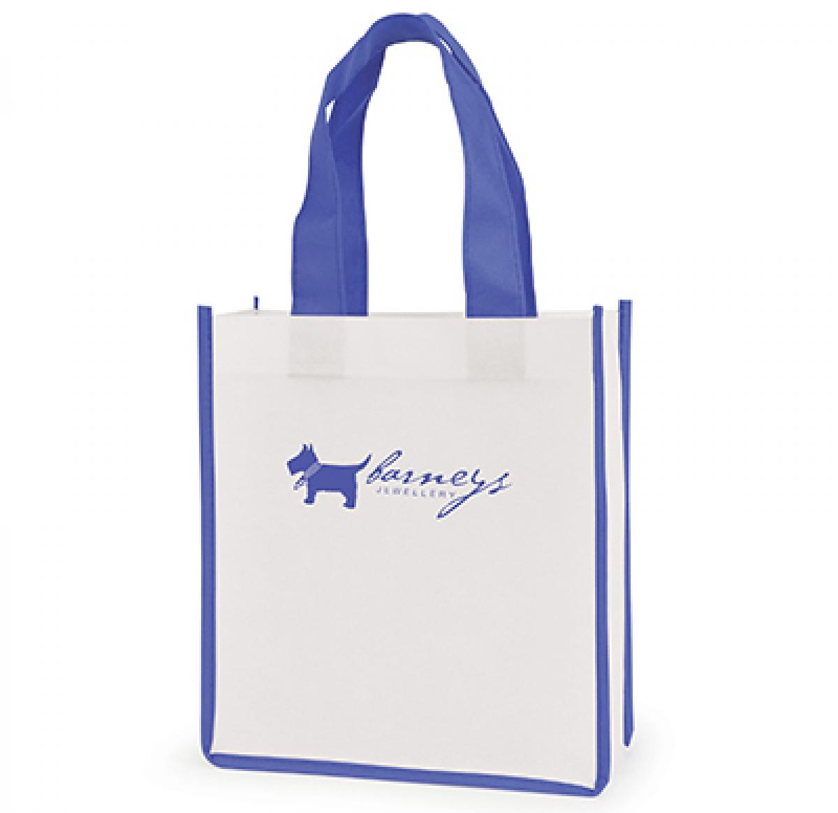 Recyclable 80gsm non woven PP mini shopper with gusset and coloured handles to match the edge trimming. Handy bag to have for throwing all yoru bits and pieces into.