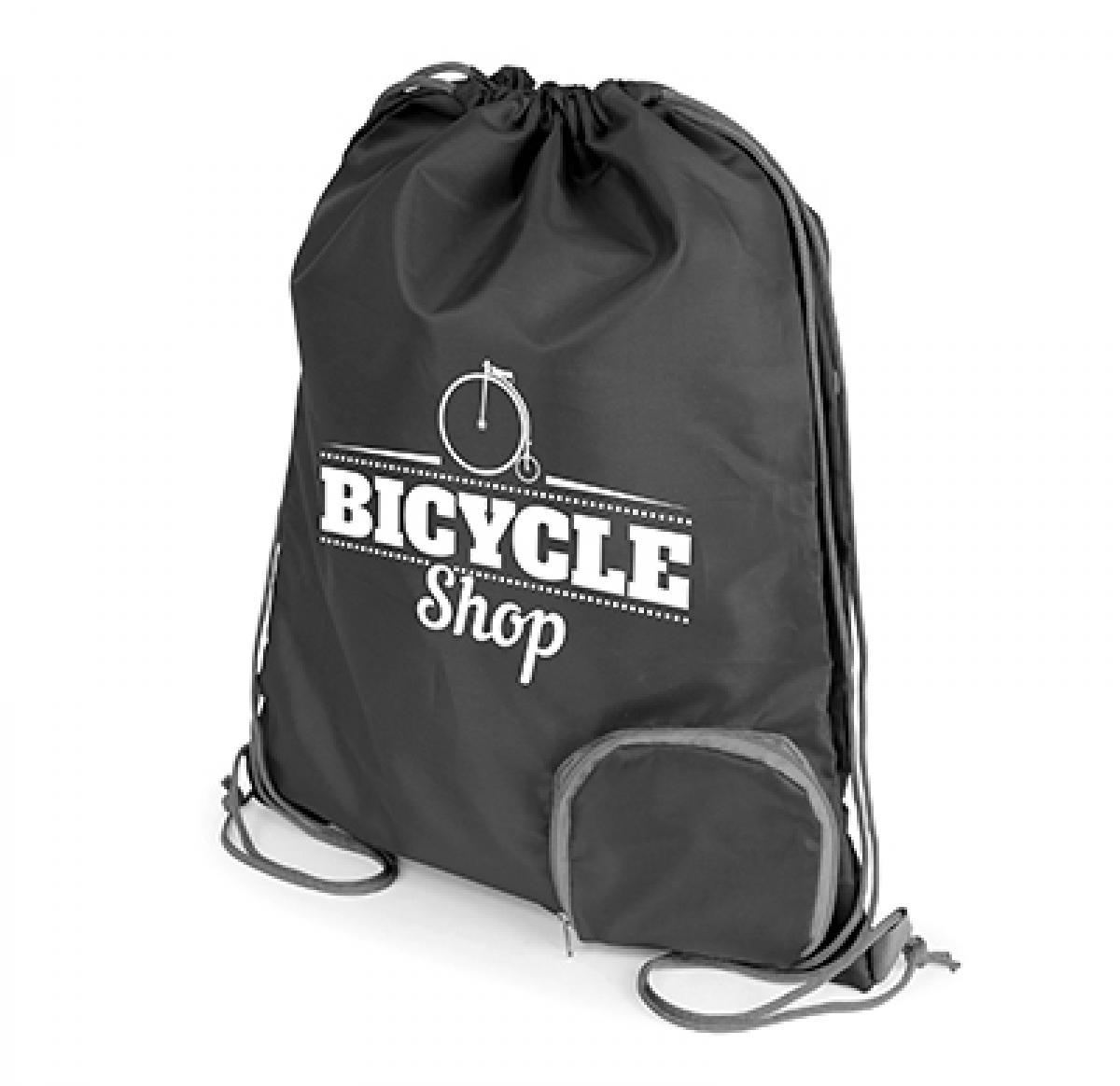 210D polyester large drawstring bag which handily folds into a pocket located in the corner of the bag and sealed with a zip. Grey drawstring and grey trim to zipped pocket.