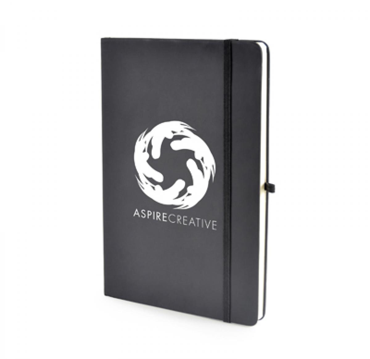 A5 black PU soft finish 80 sheet plain notebook with coloured bookmark, heavy duty card back pocket for securing business cards and loose notes, coloured elastic pen loop and coloured elastic closure.