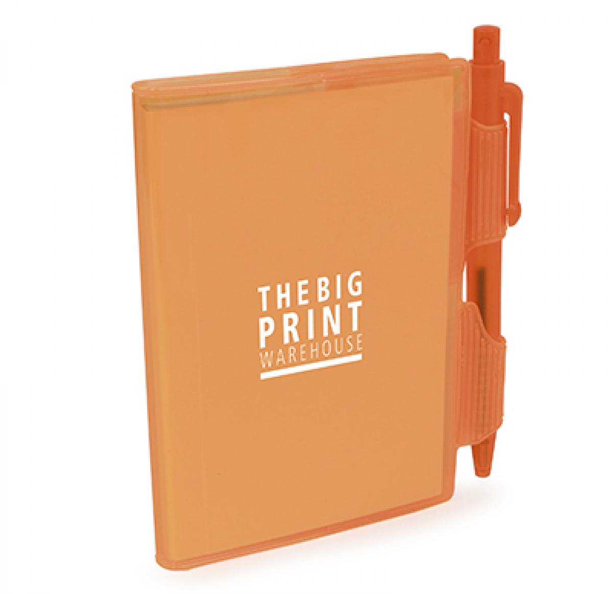 A7 0.3mm PVC notebook with 80 sheets of lined white 70gsm paper. Two PVC loops are used to secure a translucent plastic push action ball pen to the notebook.