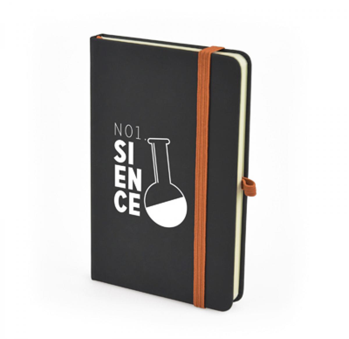 A6 black PU soft finish 80 sheet lined notebook with coloured bookmark, back pocket for securing loose notes, coloured elastic pen loop and coloured elastic closure.