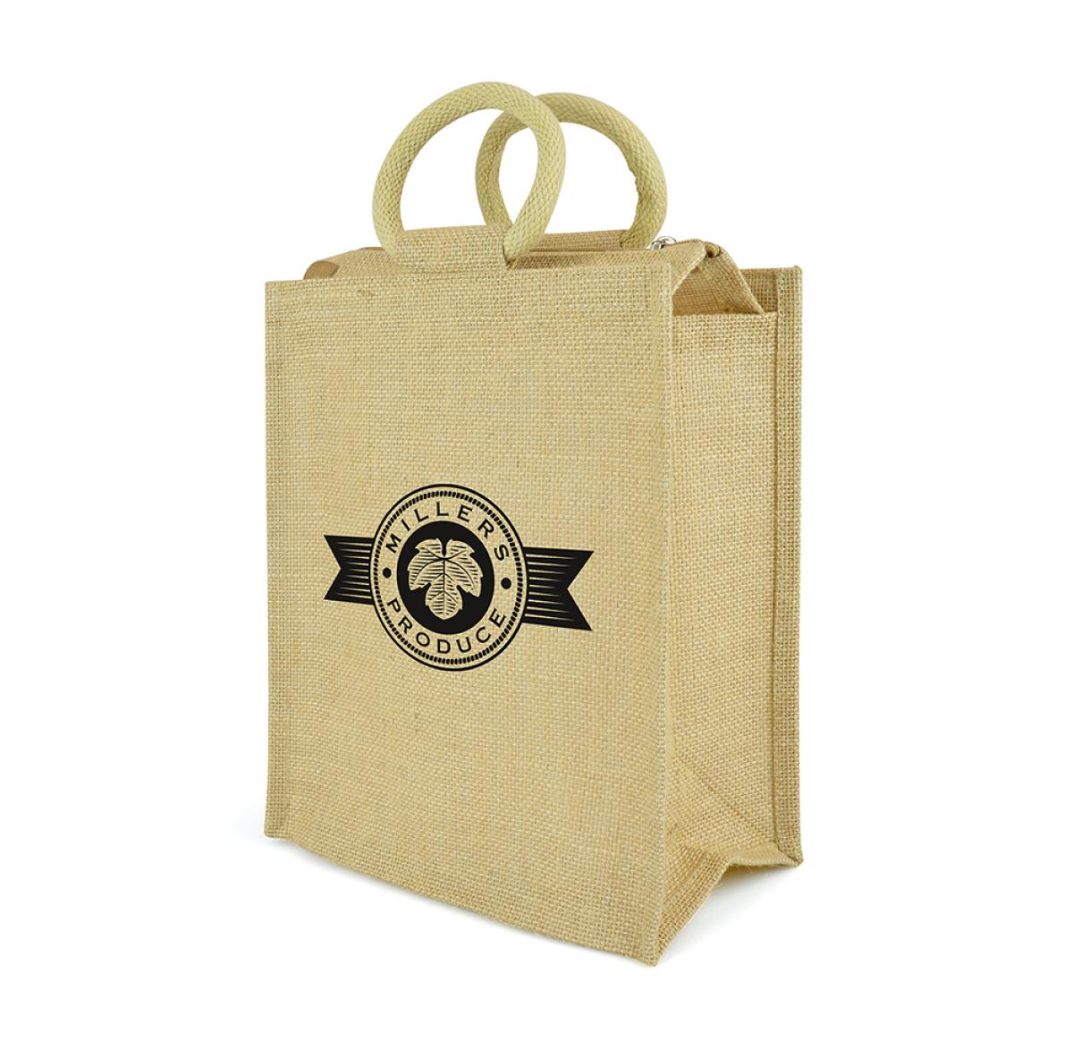 Natural laminated jute bag with zipper for top closure and jute loop padded handles. A great way to carry your lunch time and time again. Why not gift to employees whilst gaining brand exposure!