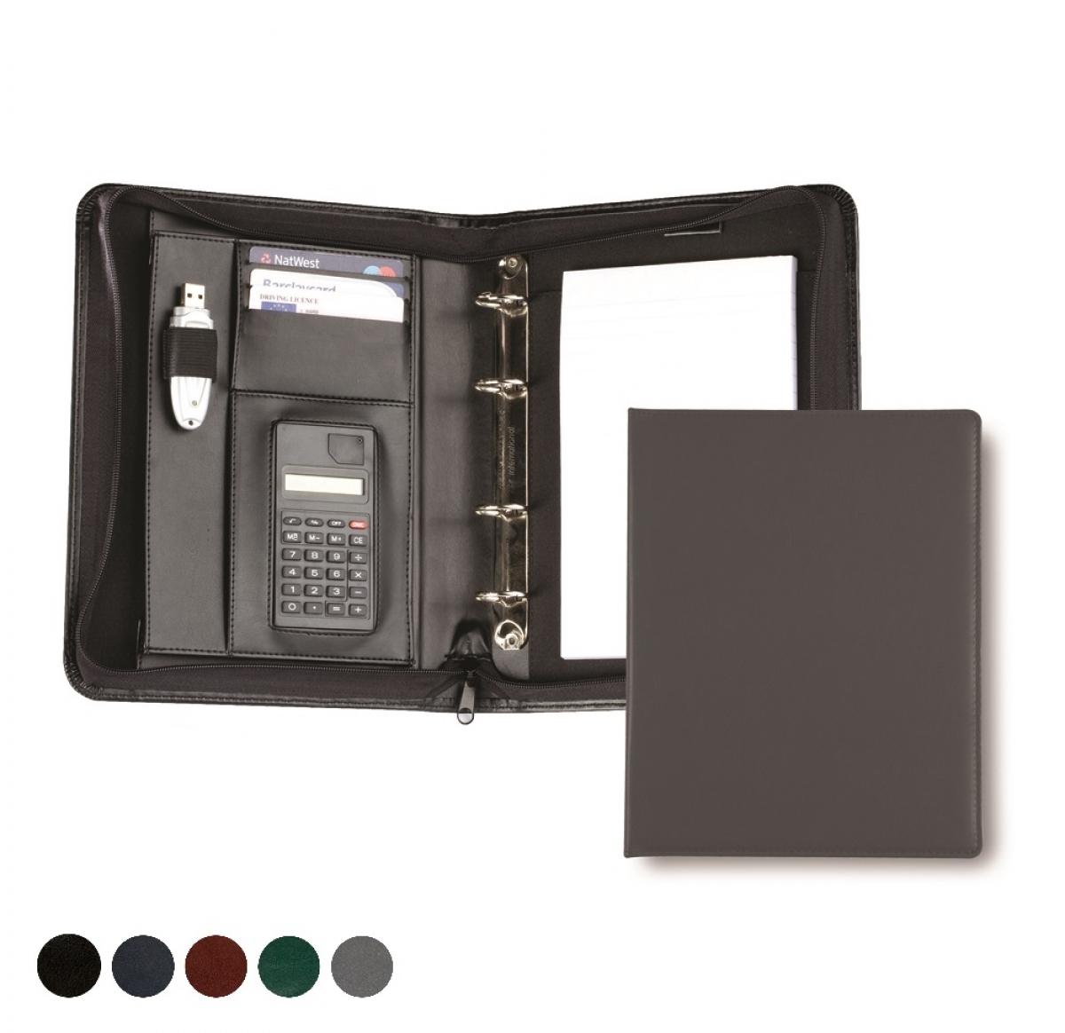 Hampton Leather A5 Deluxe Zipped Ring Binder with a lightly padded and stitched cover, finished in Hampton finecell leather which has a natural grain and an excellent emboss quality in a choice of 5 colours. Product features include Black PU Interior Pockets, Gusseted pocket for notes, Business Card Holder, Pen Loop, Fitted Lined Pad, Fitted Calculator, Removable 25mm Ring Mechanism 2 or 4 ring, Choose from a coordinating or contrasting edge stitch to the exterior cover, Easy glide zip to secure.