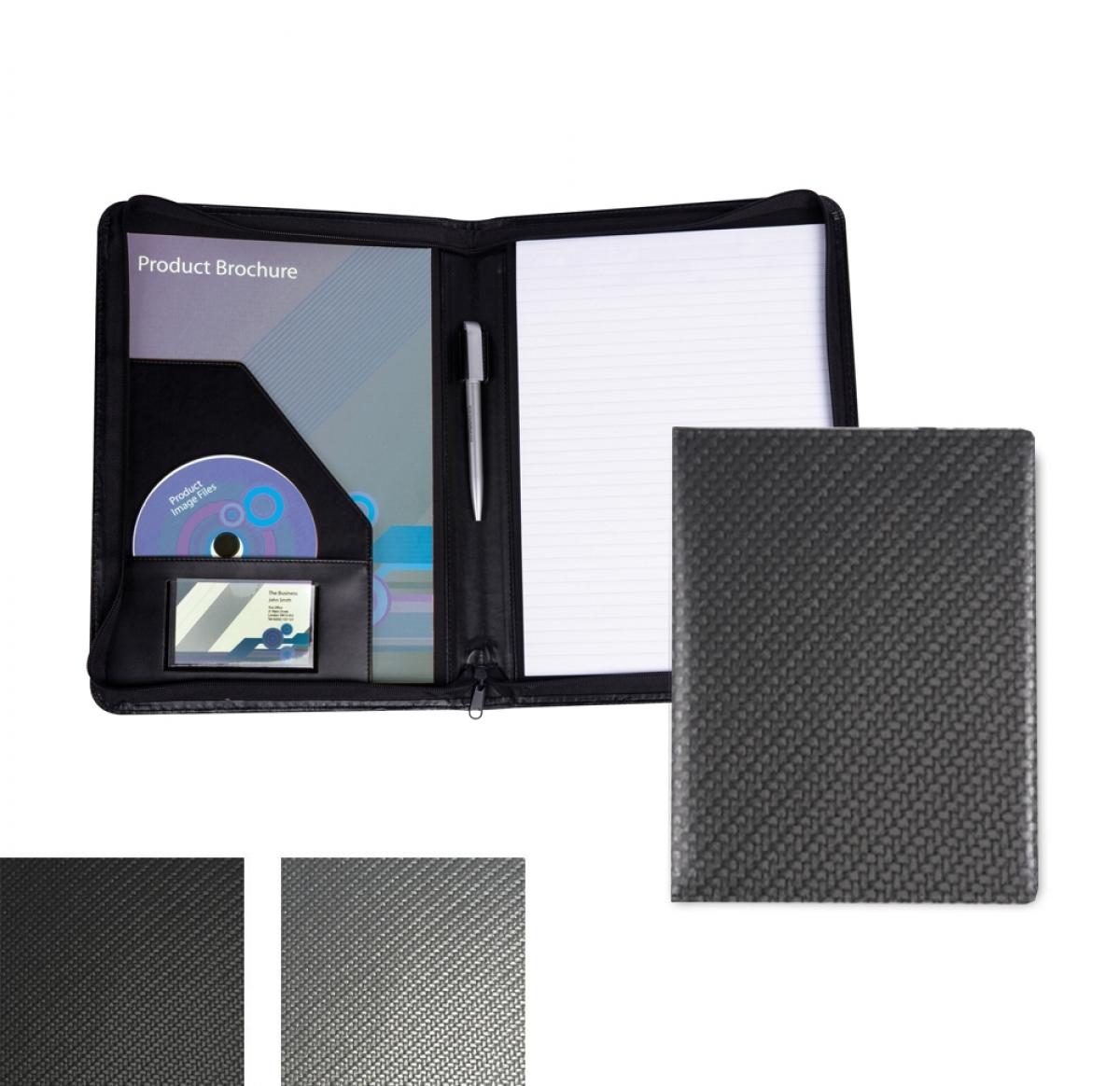 Carbon FibreA4 Zipped Conference Folder with a lightly padded and stitched cover, finished in a contemporary textured Carbon Fibre effect in a choice of black or gun metal. This material is ideal for embossing and although it can be printed the texture will show through. Product features include Black PU Interior Pockets, Angled Pockets for Notes, Business Card Holder, Pen Loop, Fitted Lined Pad, Choose from a coordinating or contrasting edge stitch to the exterior cover, Easy glide zip to secure