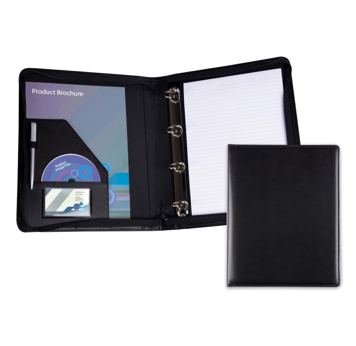 Black Belluno Zipped Ring Binder with a lightly padded and stitched cover, finished in black Belluno leather look PU, offering a real leather look and feel. Product features include Padded & Stitched Cover, Black Interior, Angled pocket for notes, Business card pocket, 25mm 2 or 4 Ring "D" Mechanism, Pen loop, Fitted lined pad.