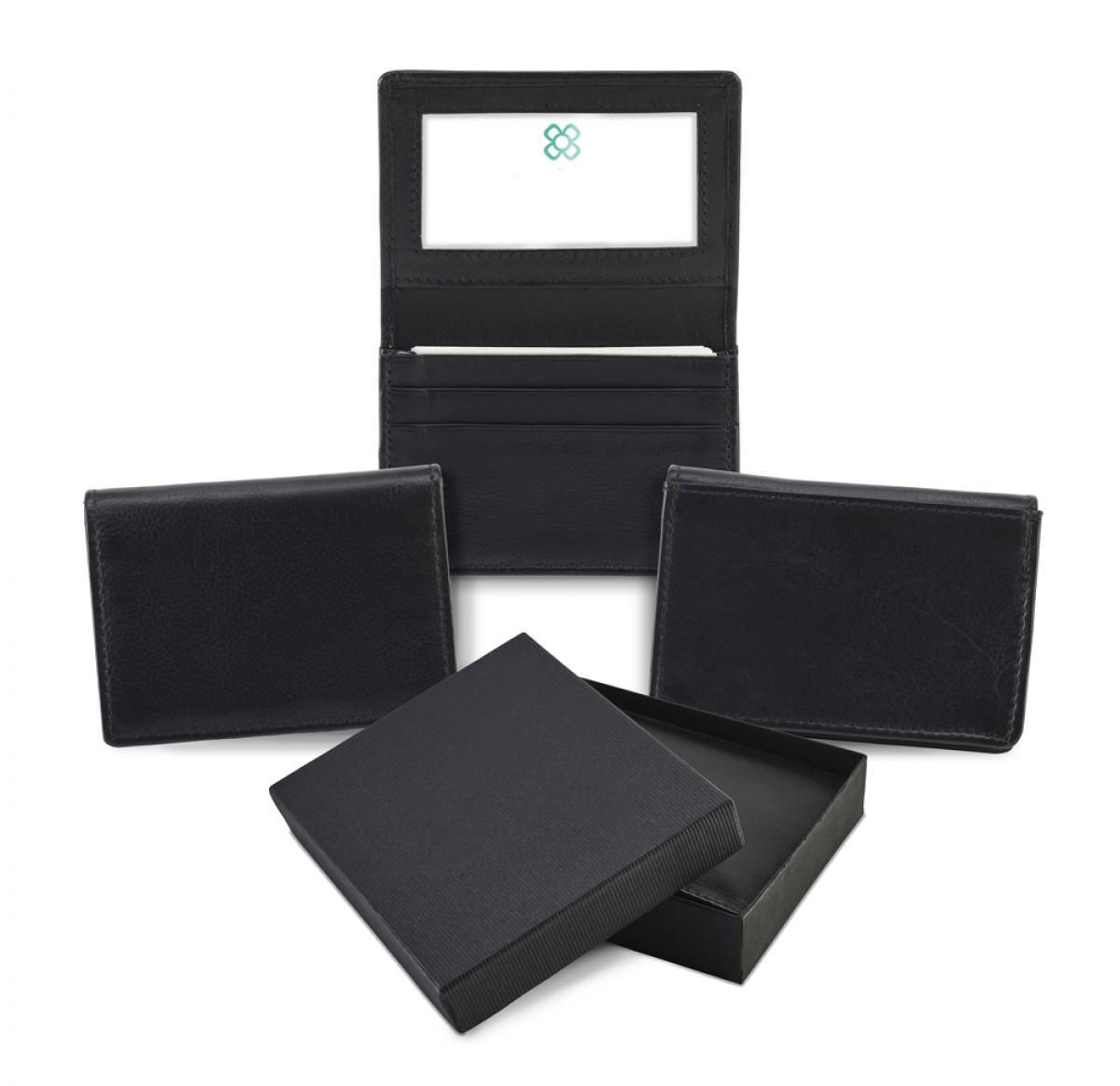 Branded Sandringham Nappa Leather Business Card Holder with Travel or Oyster Card Window finished in soft black Nappa leather with a full natural grain. Supplied in a presentation box. Product features include Framed window to hold travel, season or identity card, Large pocket to hold 30-40 business cards, Presentation box which can also be branded.