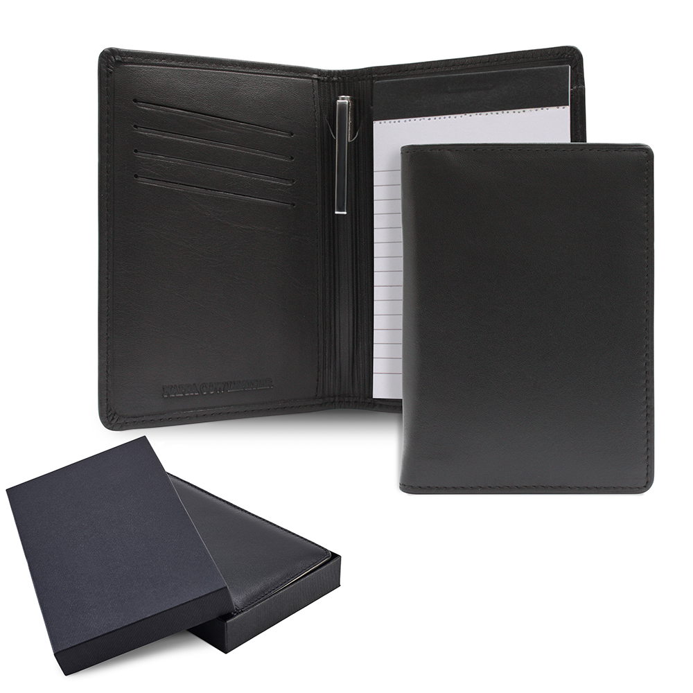 Sandringham Nappa Leather Notepad Jotter with Pen finished in high quality black Nappa leather with a full natural grain, Supplied in a presentation box. Product features include Padded and stitched cover, Plain replaceable pad, Pen Included, Credit Card Pockets to the Left, Supplied boxed, Part of a range of Sandringham Nappa Leather Executive Gifts.