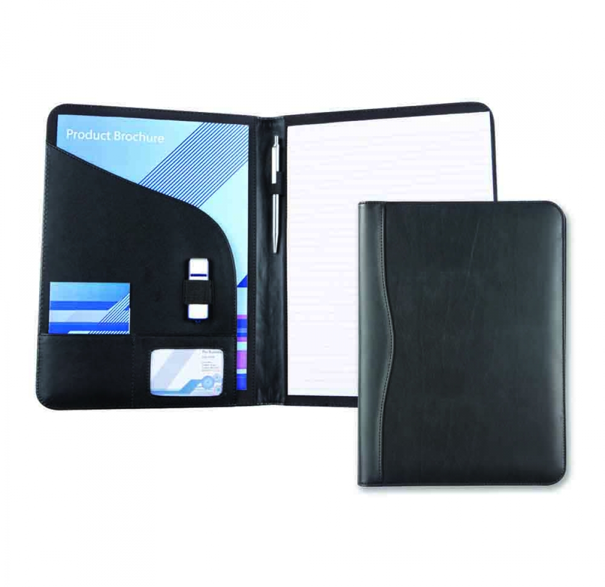 Black Houghton A4 Conference Folder with a lightly padded and stitched cover, finished in la quality leather look PU with stitching detail to the spine. Product features include Scalloped stitching detail to spine, Black Interior Pockets, Angled pocket for notes, Business Card Holder, Pen Loop, USB Flas Stick Loop, Fitted Lined Pad.