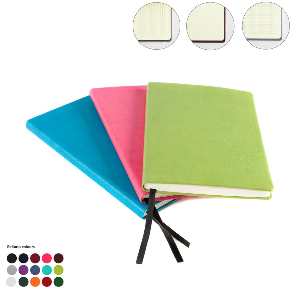A5 Casebound Notebook made to order in the UK finished in soft touch Belluno PU with a real leather look and feel. Belluno is available in a choice of 17 colours each with a unique colour change when embossed, making your branding distinctive and accurate even on fine detail. Product features include Case Bound Notebook, 96 sheets, 192 pages of 70 gsm cream paper, Choose from Lined, Squared or Plain Paper, Paper is certified as sustainably sourced, Ribbon Page Marker, Minimum from 25 pieces, Made in the UK although for larger quantities please enquire for Far East option at price advantage.