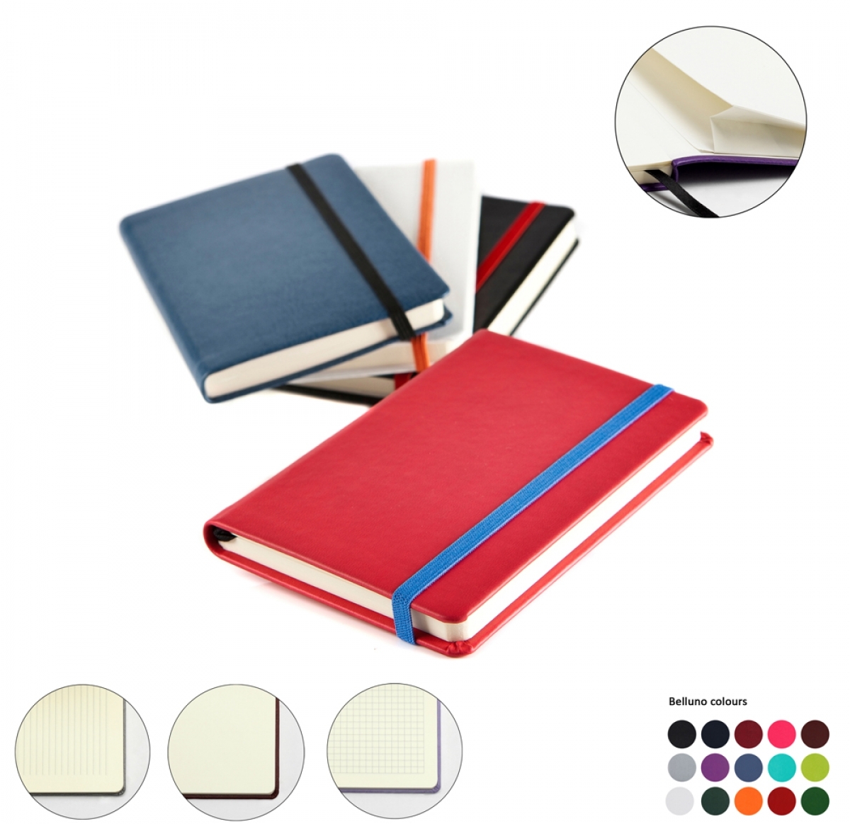 Pocket Casebound Notebook made to order in the UK finished in soft touch Belluno PU with a real leather look and feel. Belluno is available in a choice of 17 colours each with a unique colour change when embossed, making your branding distinctive and accurate even on fine detail. Product features include Case Bound Notebook, 96 sheets, 192 pages of 70 gsm cream paper, Choose from Lined, Squared or Plain Paper, Paper is certified as sustainably sourced, Ribbon Page Marker, Elastic Strap to Close in a choice of colours, Envelope Pocket to rear inside cover, Minimum from 25 pieces, Made in the UK although for larger quantities please enquire for Far East option at price advantage.