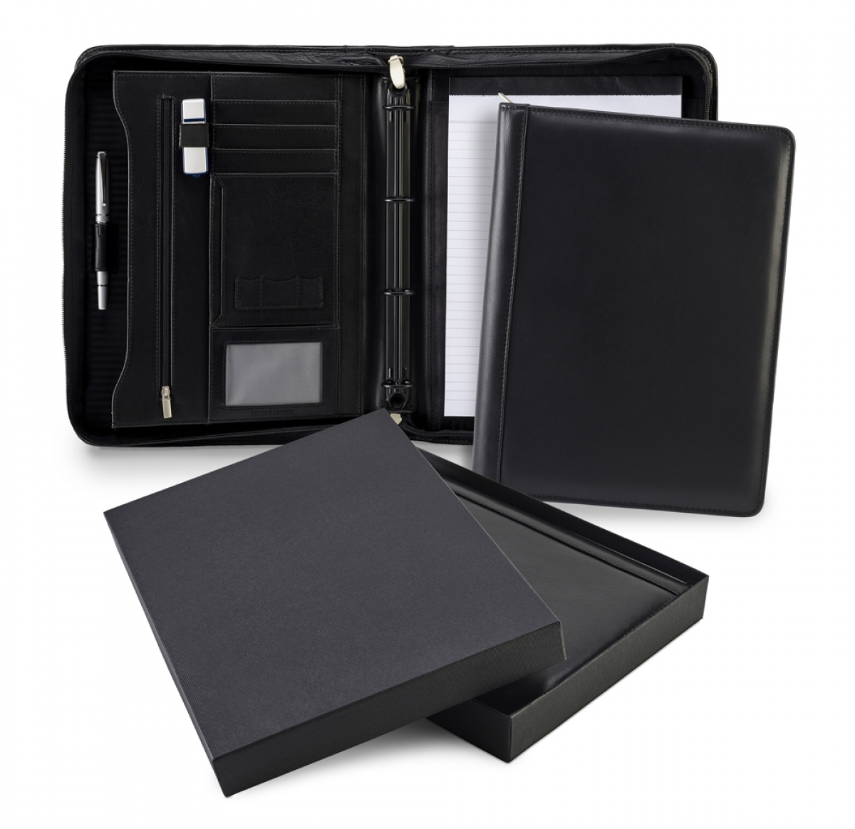 Sandringham Nappa Leather Deluxe A4 Zipped Ring Binder with a lightly padded and stitched cover, finished in soft black Nappa leather with a full natural grain. Supplied in a presentation box. Product features include Large gusseted pocket for a4 notes or brochures, Zipped pocket, SIM Card Pockets, Pen loop, USB flash stick loop, CD pocket, Business card pocket, 4 Ring Mechanism, Fitted lined pad, Zip to close, presentation box which can also be branded.