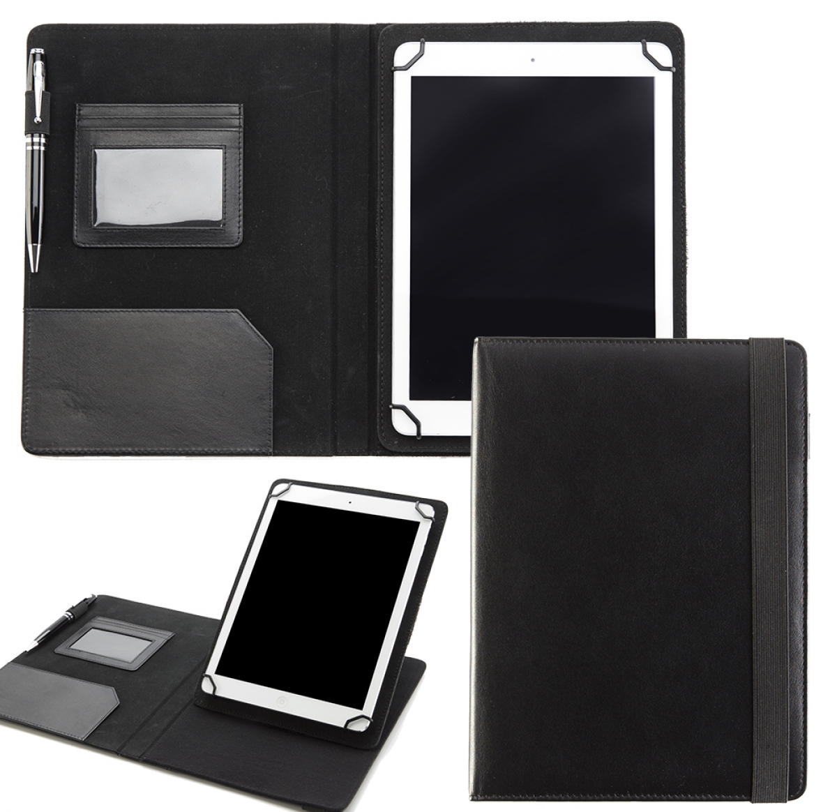 Sandringham Nappa Leather Tablet Case with adjustable tabs to fit a variety of makes and models. Black Elastic strap to close. Multi position stand which can be used portrait or landscape at a variety of angles. The cover is finished in a high quality nappa leather look which has an excellent emboss quality but equally can be screen printed or digitally printed to make your ideal brand impression. Features Black Leather Look Cover, Black Elastic Strap to Close, Dark Grey velvet touch interior to protect your tablet, Angled pocket for notes, Framed Business Card Holder, Pen Loop, Adjustable Tabs to Fit a selection of Tablets sized 7-10 inches wide to include iPad 1,2,3,Air & Air 2, Multi position stand feature in both landscape and portrait format.