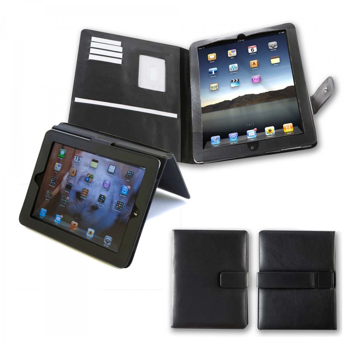 Leather iPad Organiser Case finished in high quality black nappa leather with a full natural grain, supplied in a presentation box. Product features include Framed pocket to hold iPad, Credit card slots or business card slots, Framed clear pocket for business card, Pocket for notes or CD's, Strap and press stud to secure, Strap loops and secures to convert the case to a stand, Ideal for viewing or working with you iPad whilst on the move, Ideal for sales or product demonstrations .