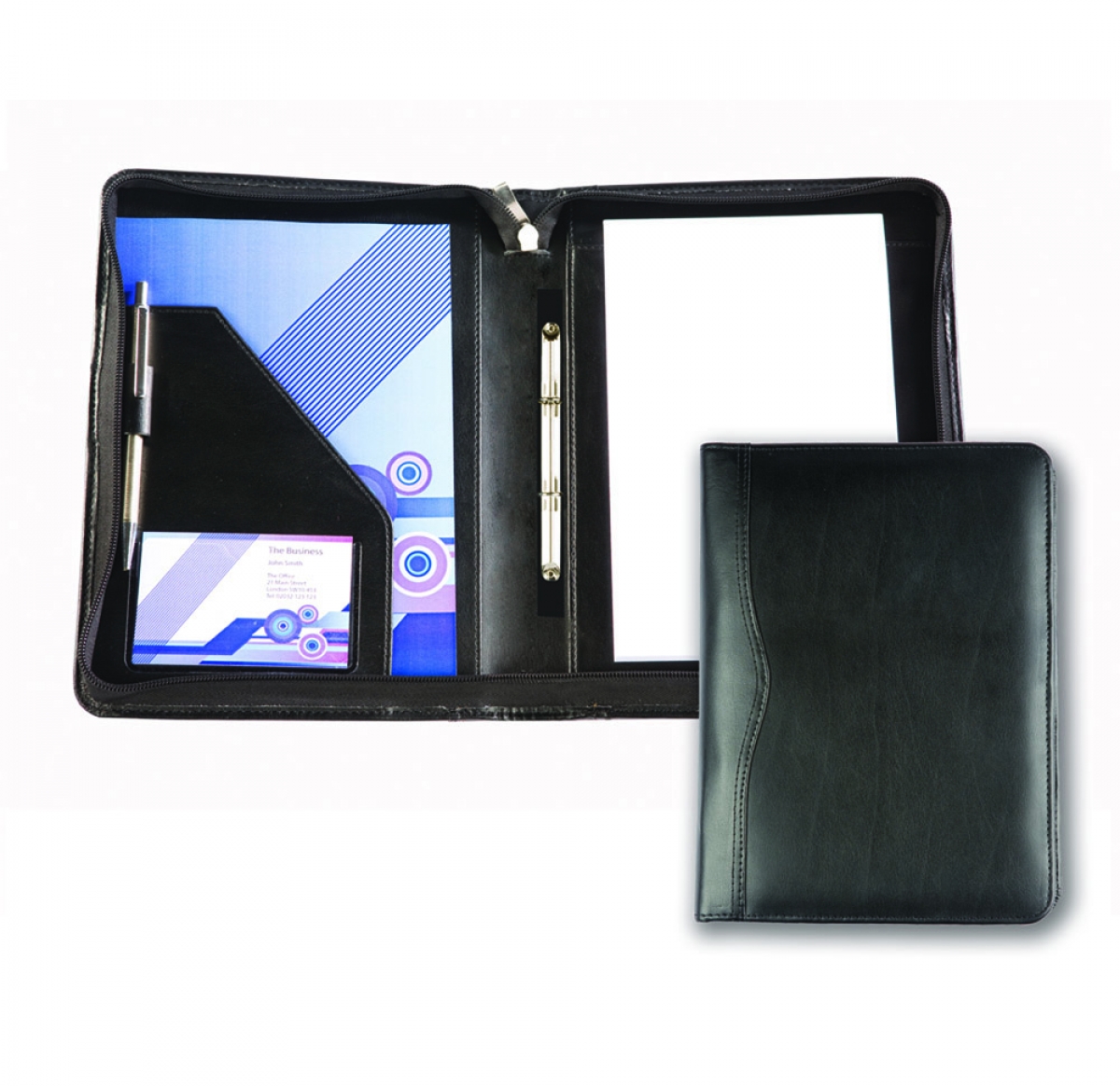 Black Balmoral Leather A5 Zipped Ring Binder with a lightly padded and stitched cover, finished in a Balmoral bonded leather formed from recycled leather waste bonded to form a soft material with an excellent emboss quality and a smooth grain. Supplied boxed. Product features include Black Interior Pockets, Angled Pockets for Notes, Business Card Holder, Pen Loop, Fitted Lined Pad, Zip to close, 13 or 16mm Ring Mechanism, Supplied boxed.
