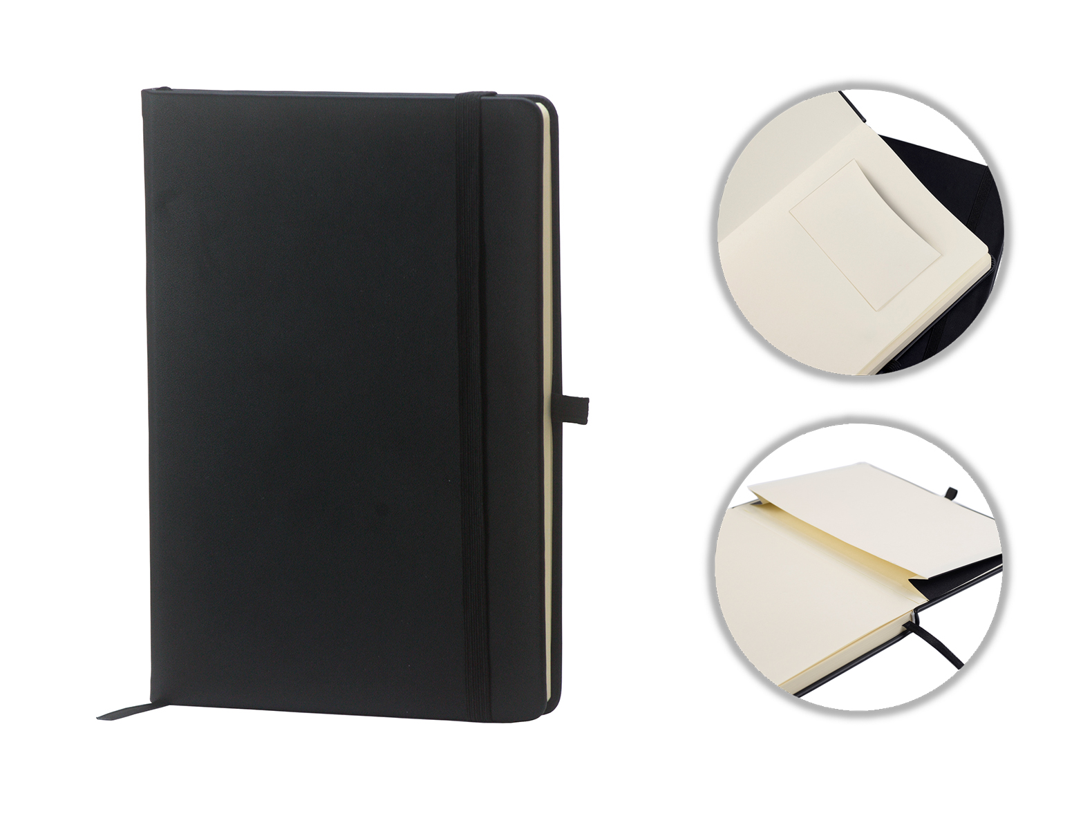 Houghton A5 Casebound Notebook with Business card pocket to front, 95 cream lined pages, black page marker, black elastic strap, rear envelope pocket. Finished in a manmade leather look which has an excellent emboss quality but can equally be printed one or full colour.