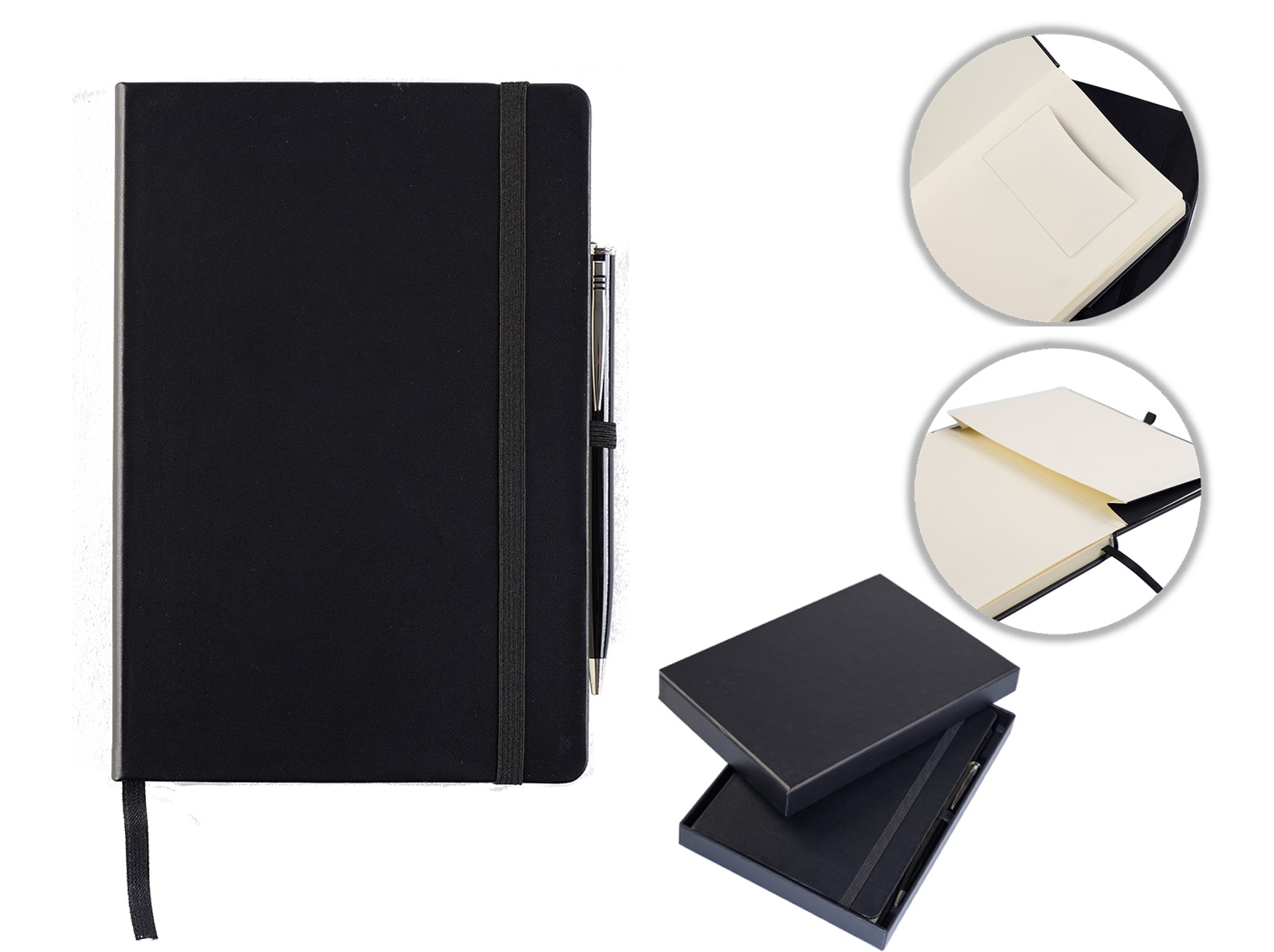 Houghton A5 Casebound Notebook with Business card pocket to front, 95 cream lined pages, black page marker, black elastic strap, rear envelope pocket. Fitted with a black & silver ball point pen in a back presentation lid box. Finished in a manmade leather look which has an excellent emboss quality but can equally be printed one or full colour.