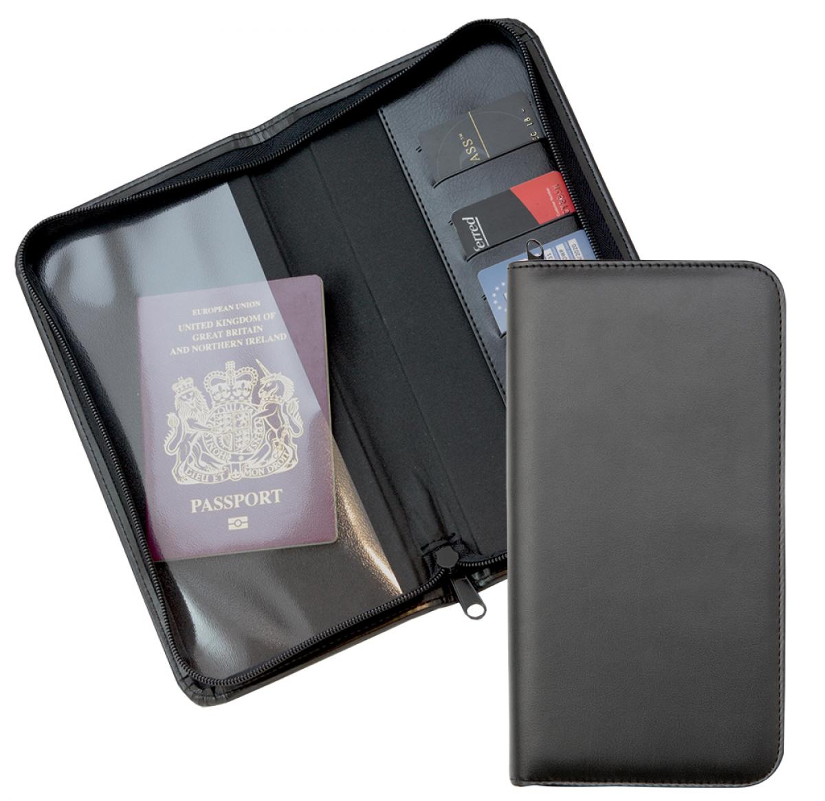 Zipped Travel Wallet with one clear pocket and one material pocket with card slots, finished in black Belluno leather look PU, offering a real leather look and feel. Product features include One Clear interior pocket ideal to hold passports, boarding cards, tickets and currency, One matching PU pocket with slots for credit cards, Folded and stitched edges for a quality finish.