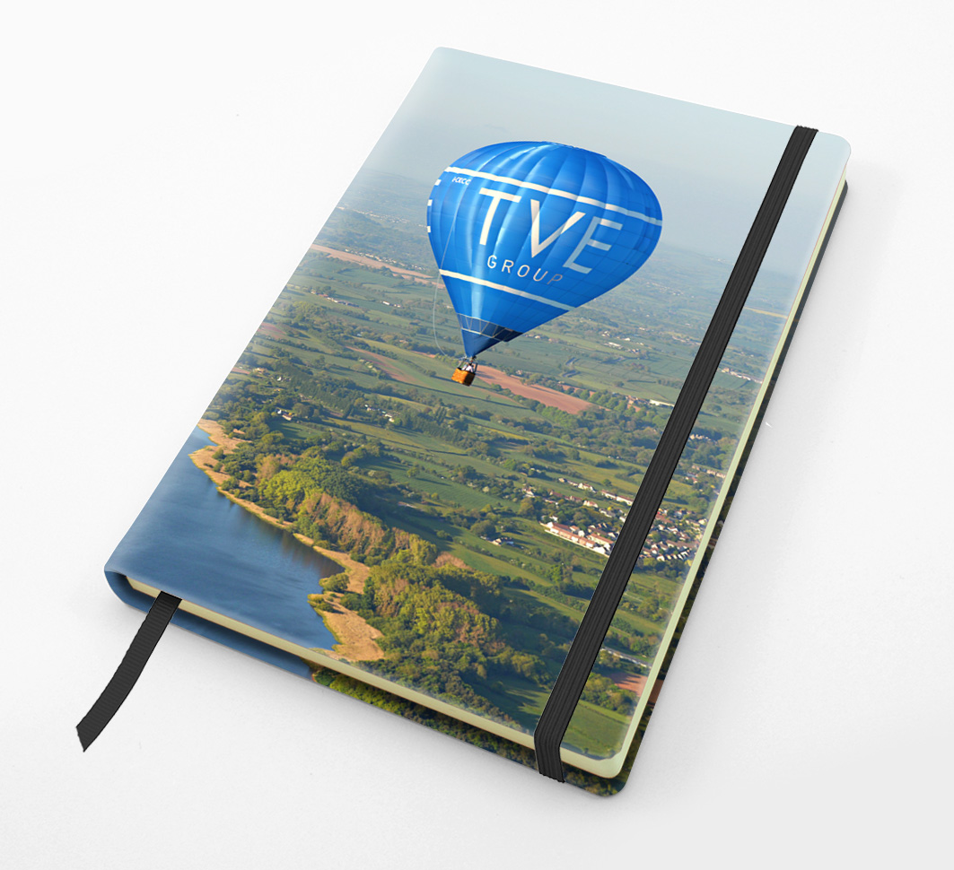 A5 Full Digital Colour Casebound Notebook with an image or design over the entire cover to include full photographic content or pantone match with integral logo or print. A further emboss logo can be applied but the material will not colour change. Product features include Case Bound Notebook, 96 sheets, 192 pages of 70 gsm cream wood free recycled paper, Choose from Lined, Squared or Plain Paper, Paper is certified as sustainably sourced, Ribbon Page Marker, Elastic Strap to Close in a choice of colours, Envelope Pocket to rear inside cover, Minimum from 25 pieces, Made in the UK although for larger quantities please enquire for Far East option at price advantage.