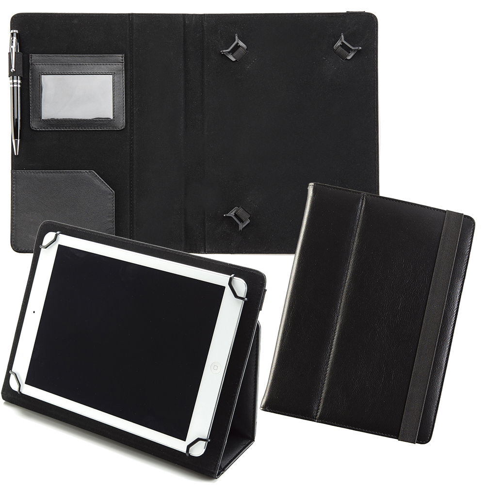 Sandringham Nappa Leather Tablet Case with adjustable tabs to fit a variety of makes and models. Black Elastic strap to close. Converts to a stand.to enable easy viewing of your screen. The cover is finished in a high quality Nappa leather look which has an excellent emboss quality but equally can be screen printed or digitally printed to make your ideal brand impression. Features include a Black Elastic Strap to Close, Dark Grey velvet touch interior to protect your tablet, Angled pocket for notes, Framed Business Card Holder, Pen Loop, Adjustable Tabs to Fit a selection of Tablets sized 7-10 inches wide to include iPad 1,2,3,Air & Air 2.