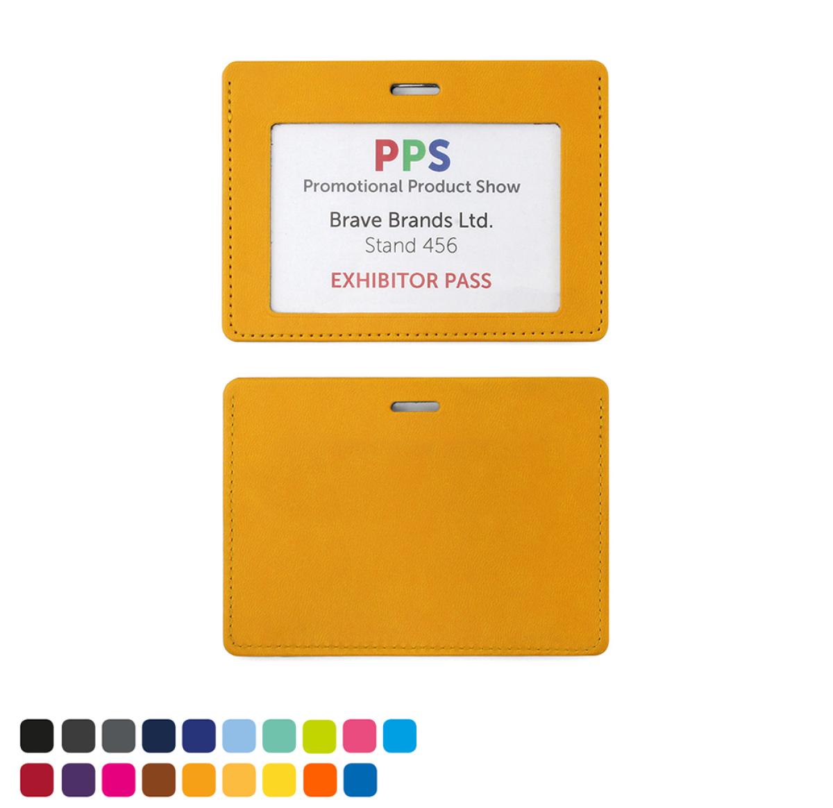 Landscape ID Card Holder for a Lanyard or Clip, finished in matt velvet, soft touch Torino vegan PU in a choice of 19 colours, each with a unique colour change when embossed. Product features include - Turned and stitched edges, Clear window to show your ID card or season ticket, large branding area to rear, Lanyard not Included.