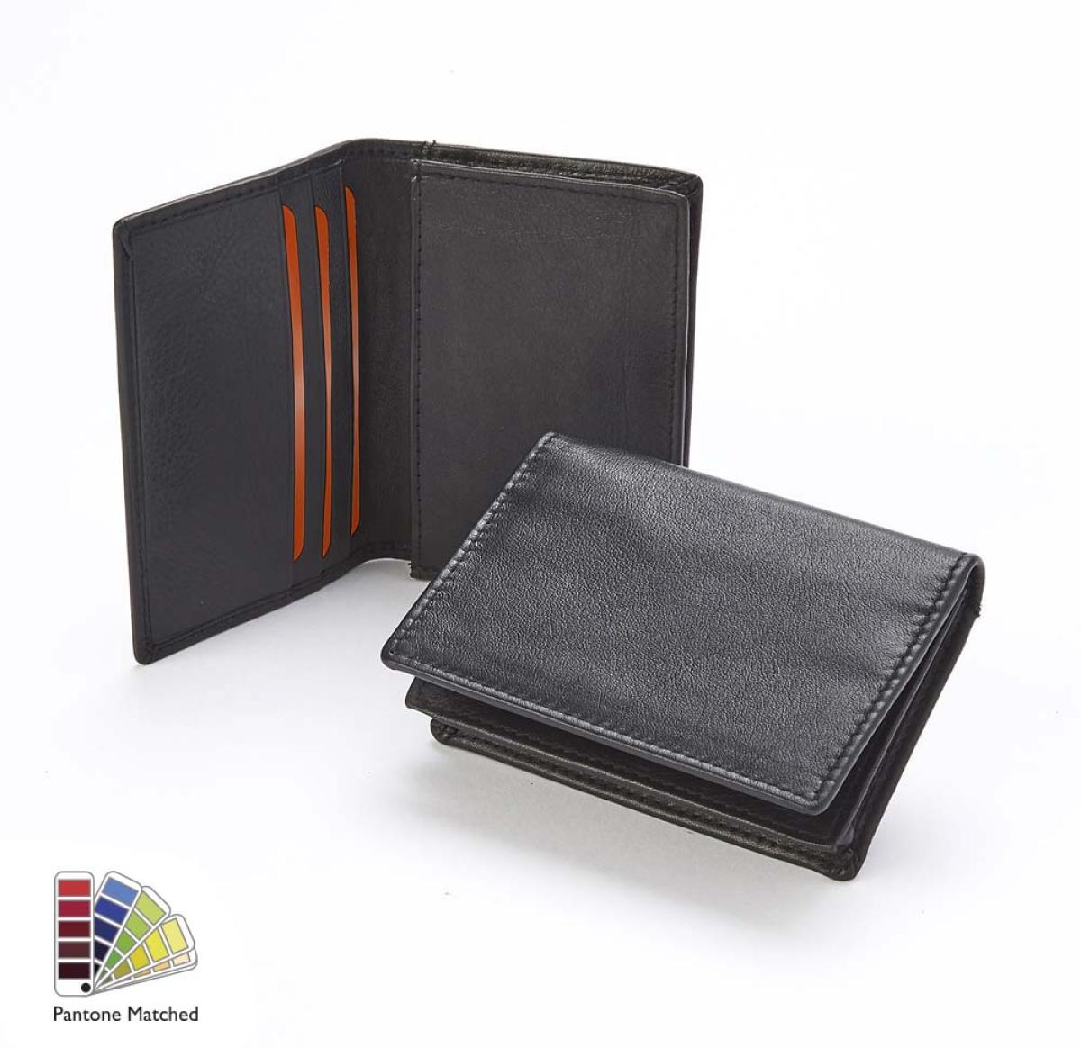 Sandringham Nappa Leather Business Card Holder made to order in any Pantone Colour. Available with matching or contrasting stitching, black or coloured lining, mix and match for a bespoke look. Supplied in a black gift box. Ideal for Debossed or foil blocked personalisation, full colour personalisation also available. Product features include Genuine Nappa Leather with a beautiful soft touch, Large gusseted pocket to hold 30-40 cards, Three card pockets to the inner flap to hold credit or business cards, Additional pocket to the back of the case, ideal for your travel or credit card, Supplied in a black lid box which can also be branded.