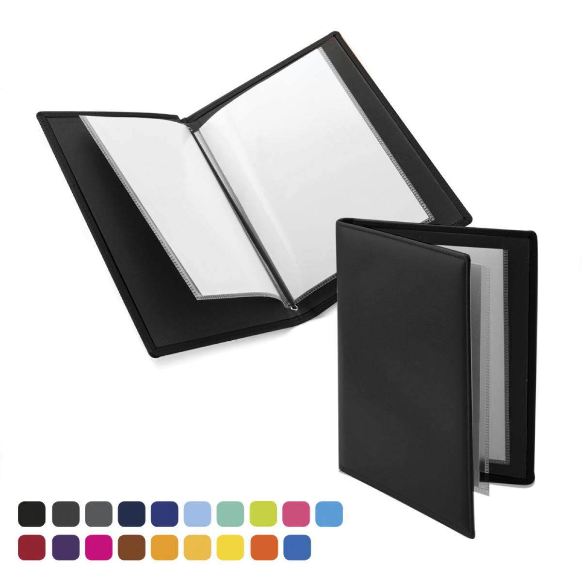 A5 Wine List or Menu Holder finished in matt velvet, soft touch Torino vegan PU in a choice of 19 colours, each with a unique colour change when embossed. Product features include - Lightly padded and stitched for a quality finish, 1 double clear pocket sewn to the spine to display 4 sides of a5 sheets of information, Choose from coordinating or contrasting edge stitching, Colours interior lining, Made to order in the UK.