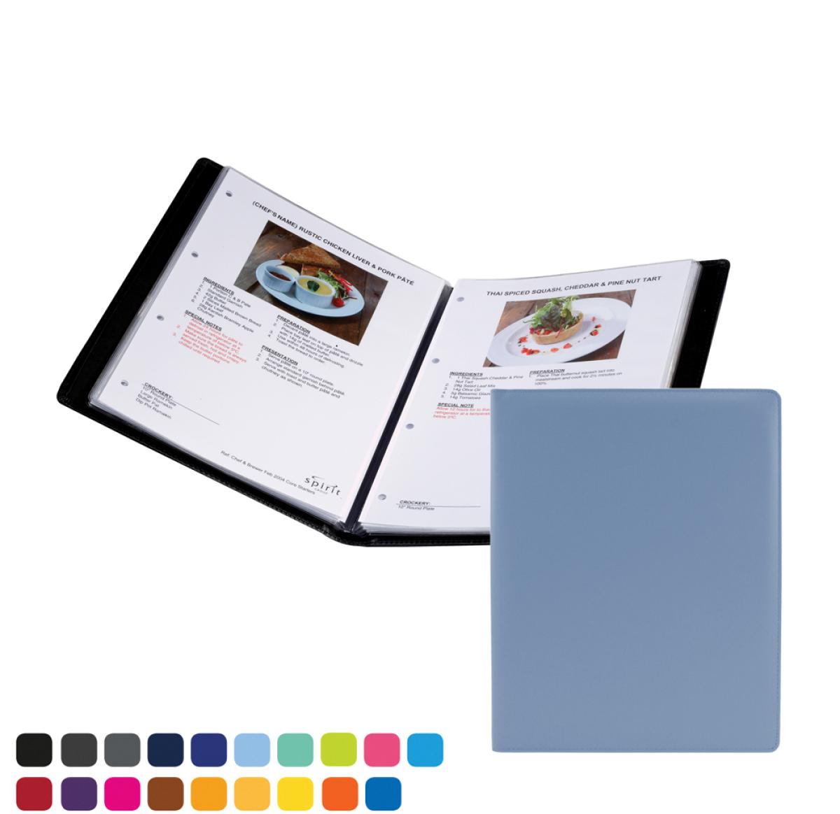 A4 Information, Wine List or Menu Holder finished in matt velvet, soft touch Torino vegan PU in a choice of 19 colours, each with a unique colour change when embossed. Product features include - Lightly padded and stitched for a quality finish, 1 Double Clear Pocket sewn to the spine to hold a4 sheets of information, Choose from coordinating or contrasting edge stitching