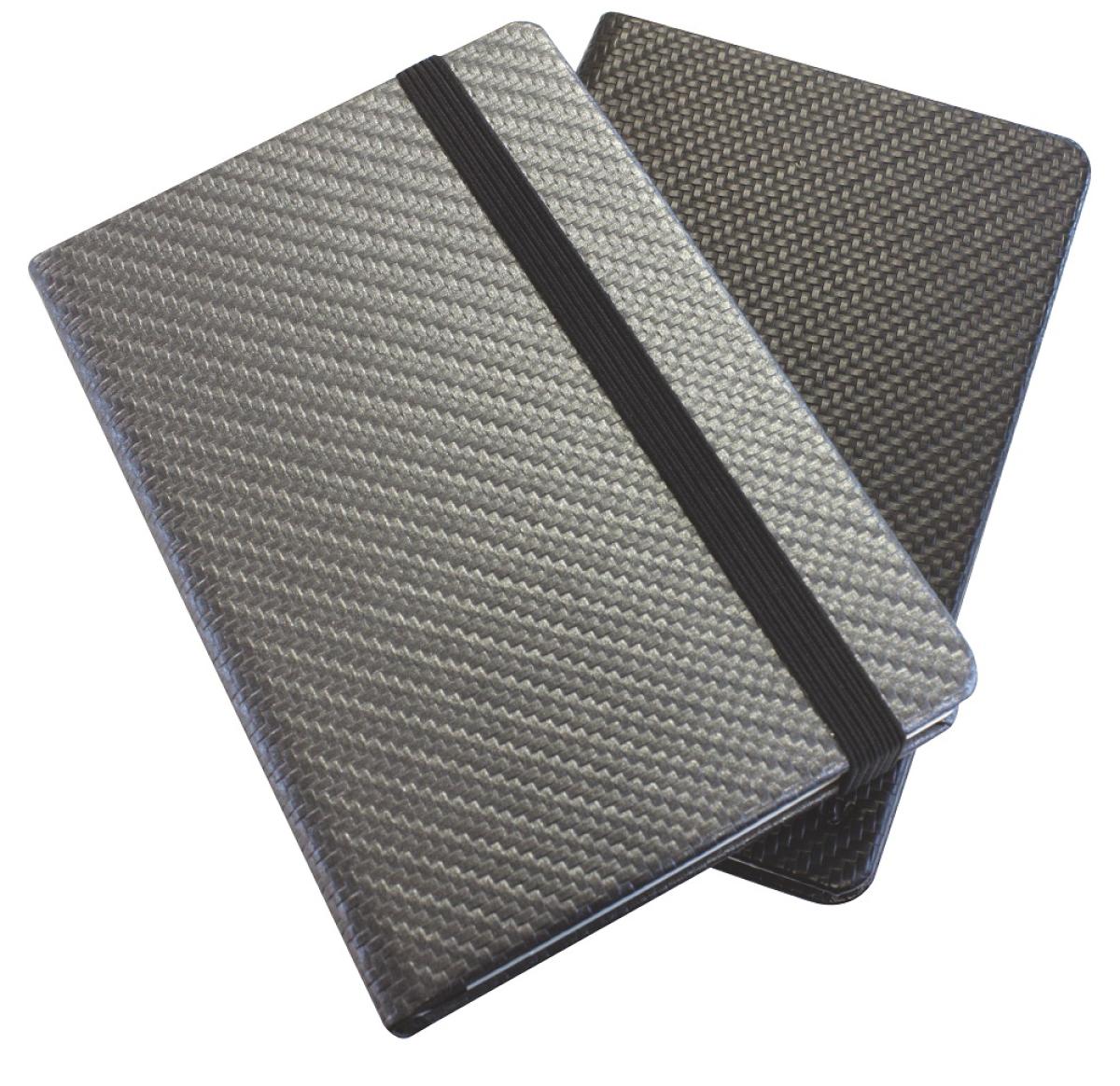 Black Carbon Fibre Textured A5 Casebound Notebook with Elastic Strap with a textured metallic effect vegan cover made to order in the UK in a choice of 4 colours. Ideal for deboss, foil blocked branding it can be or printed one or full colour although the texture will show through. Product features include - Casebound hard backed notebook, Elastic Strap in a choice of colours to match or contrast, 96 pages, 192 sides of 80gsm sustainably sourced paper, Radius corners to each page , Sewn bound for a perfect 180 degree lie flat finish, Choose from lined, squared or plain cream paper, lined or dot white paper, 100% recycled paper available please enquire, Ribbon page marker in a choice of colour to match or contrast, Made to order in the UK.