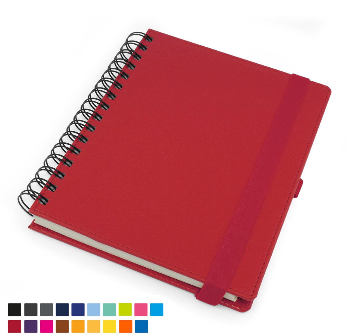Deluxe A5 Wiro Notebook with Elastic Strap & Pen Loop finished in matt velvet, soft touch Torino vegan PU in a choice of 20 colours each with a unique colour change when embossed. Product features include - Belluno leather look cover to the front and rear in a choice of 20 colours, Perimeter stitching to match or contrast, Black Wiro, 96 page of lined or plain cream paper, Elastic strap in a choice of colours, Elastic pen loop in a choice of colours, Clear pocket to the inside cover.