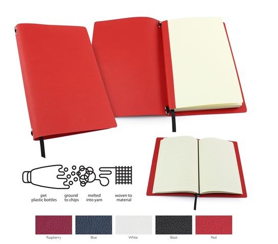 Swap Out Notebook, Cover in Recycled Como the inner a5 notebook is 100% recycled from post consumer waste. It has white lined paper and is secured in the cover by an elastic. Once finished the notebook can be replaced and recycled in normal paper recycling. The cover can be used over and over again. Product features include - Reusable Jacket made from recycled plastic bottles, 100% Recycled white lined inner notebook, Notebook can be replaced when full, Notebook can be recycled in normal paper recycling at end of life, Made in the UK, Ideal for debossed or digitally printed branding