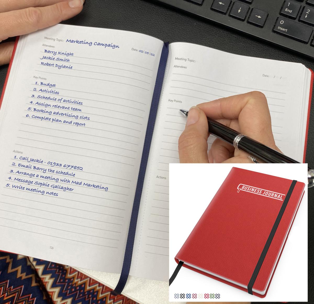 A5 Casebound Business Planner This planner combines a traditional lined notebook with added To Do Lists, Meeting Agendas Pages with action points and also dot grid & plain paper that is perforated for neat removal.. Finished in Como in a choice of 8 colours, a quality material made from waste plastic bottles that would normally go to landfill. This high-quality vegan material has a subtle grain ideal for debossed, foil blocked or full colour branding. Product features include - Product features include - Casebound hard backed notebook, Elastic Strap in a choice of colours to match or contrast, 96 pages, 192 sides of 80gsm white recycled paper, Personal details page, Contents Page, Start any month, month to view diary, 80 lined pages, 34 To Do List Pages, 30 Meeting Agenda Pages, 16 Dot Grid Pages, 18 Plain Pages. Radius corners to each page , Sewn bound for a perfect 180 degree lie flat finish, Ribbon page marker in a choice of colour to match or contrast, Made to order in the UK.