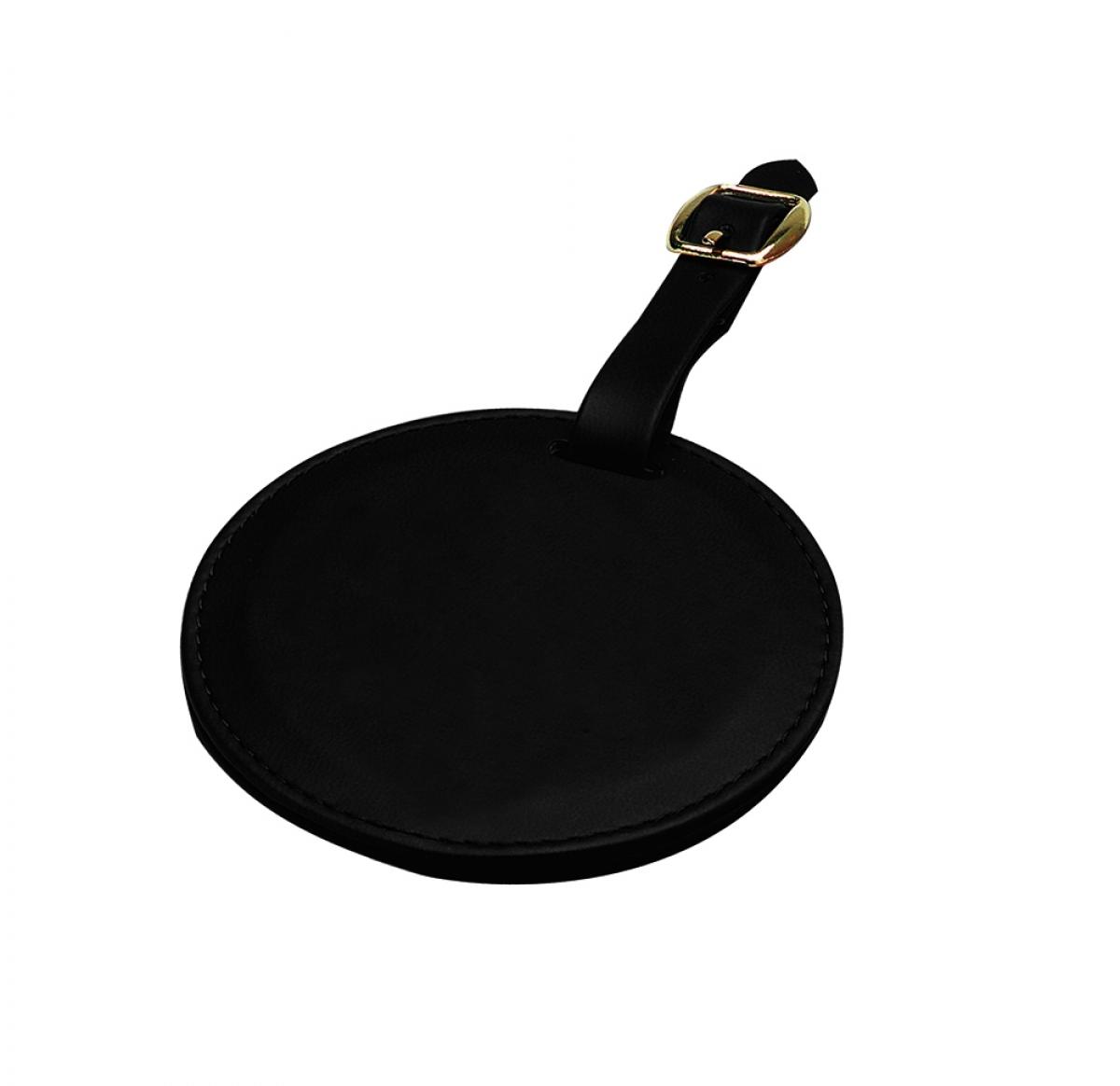 Round Bag Tag finished in black soft touch Belluno PU with a real leather look and feel. Belluno has a unique colour change when embossed, making your branding distinctive and accurate even on fine detail. Product features include Round stitched and folded tag, Strap with a chrome buckle to secure to bag, Ideal for golf bags or luggage.