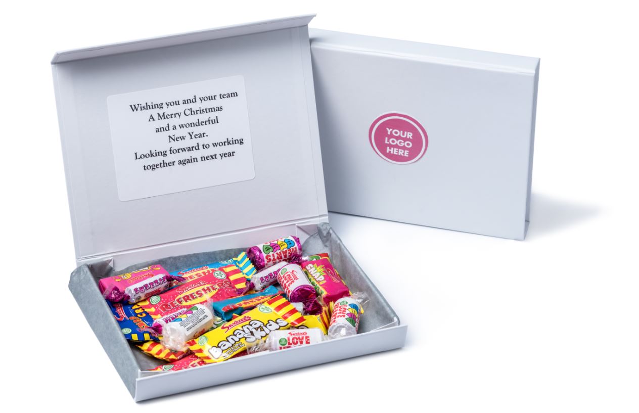 Fun box of letterbox retro sweets, the perfect gift to send to friends and clients - printed with your business logo and personalised message.