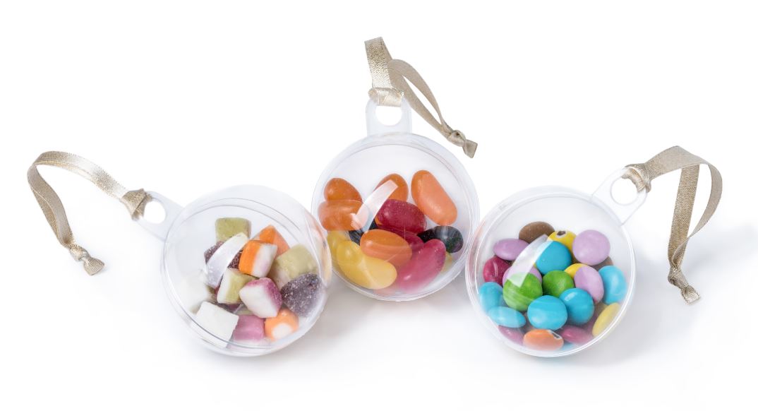 Lovely different Christmas Gift! Christmas Baubles filled with sweets with your logo and business message on the tag. Jelly Beans, Smarties or Retro Sweets in a clear bauble will make your tree stand out!