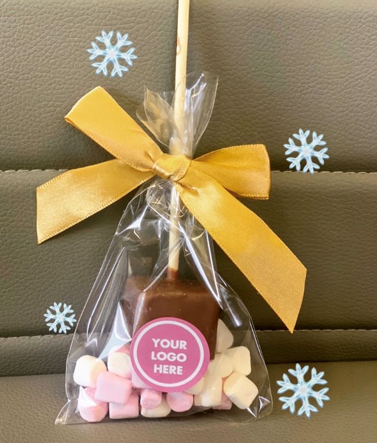 Tis the season to be warm! Snuggle up with a nice hot chocolate drink whilst it is cold outside. Make your own hot chocolate with our hot chocolate stick and cuddly little fluffy marsmallows. Branded with your artwork and message or choice of name.